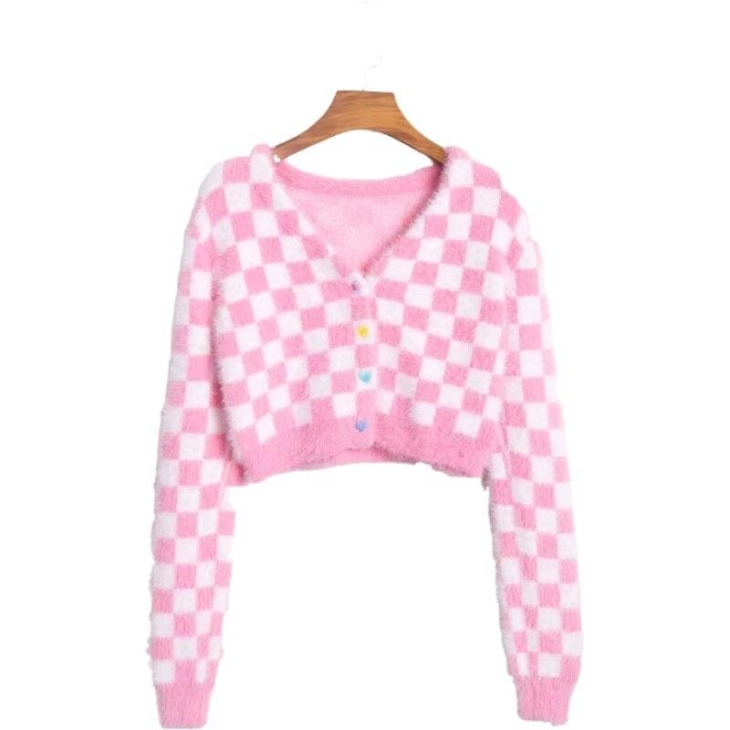 Gilet à motifs carreaux en rose et blanc. Ce vêtement à la coupe courte offre un design unique inspiré de la mode japonaise.