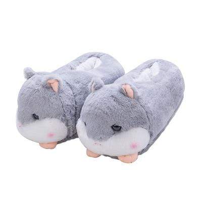 Paire de chaussons douillets en forme de hamster gris.