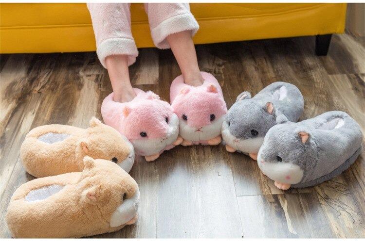 Chaussons en peluche représentation hamster, parfaits pour garder vos pieds au chaud cet hiver.